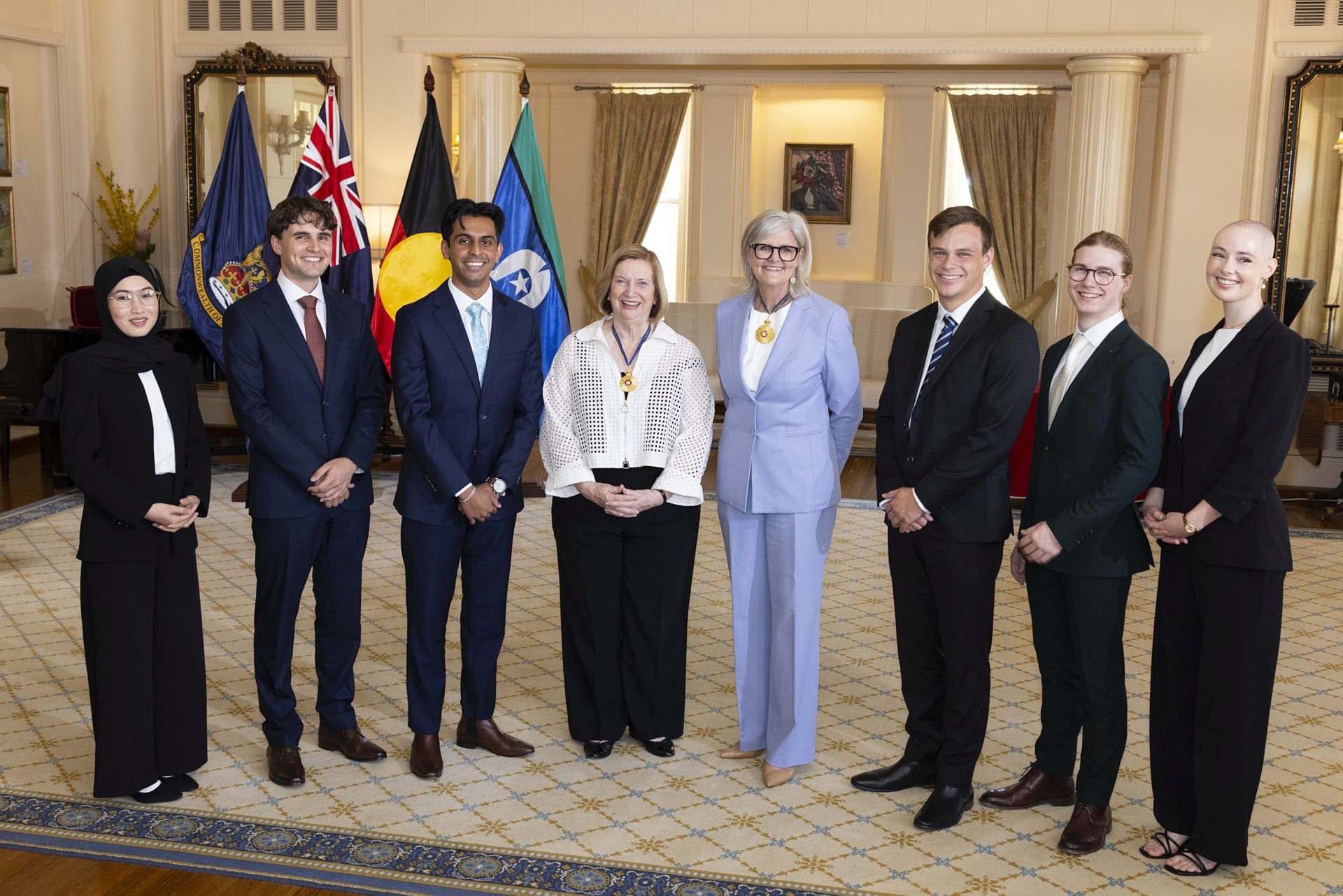 Left to right: Nazia Safdari; Jake Barnett; Isum Malawaraarachchi; Dr Helen Nugent AC, Chairman of the Order of Australia Association Foundation; The Governor-General, Her Excellency, the Hon. Sam Mostyn AC; Ockert Visser; Zeph Hardie; Miriam Grice